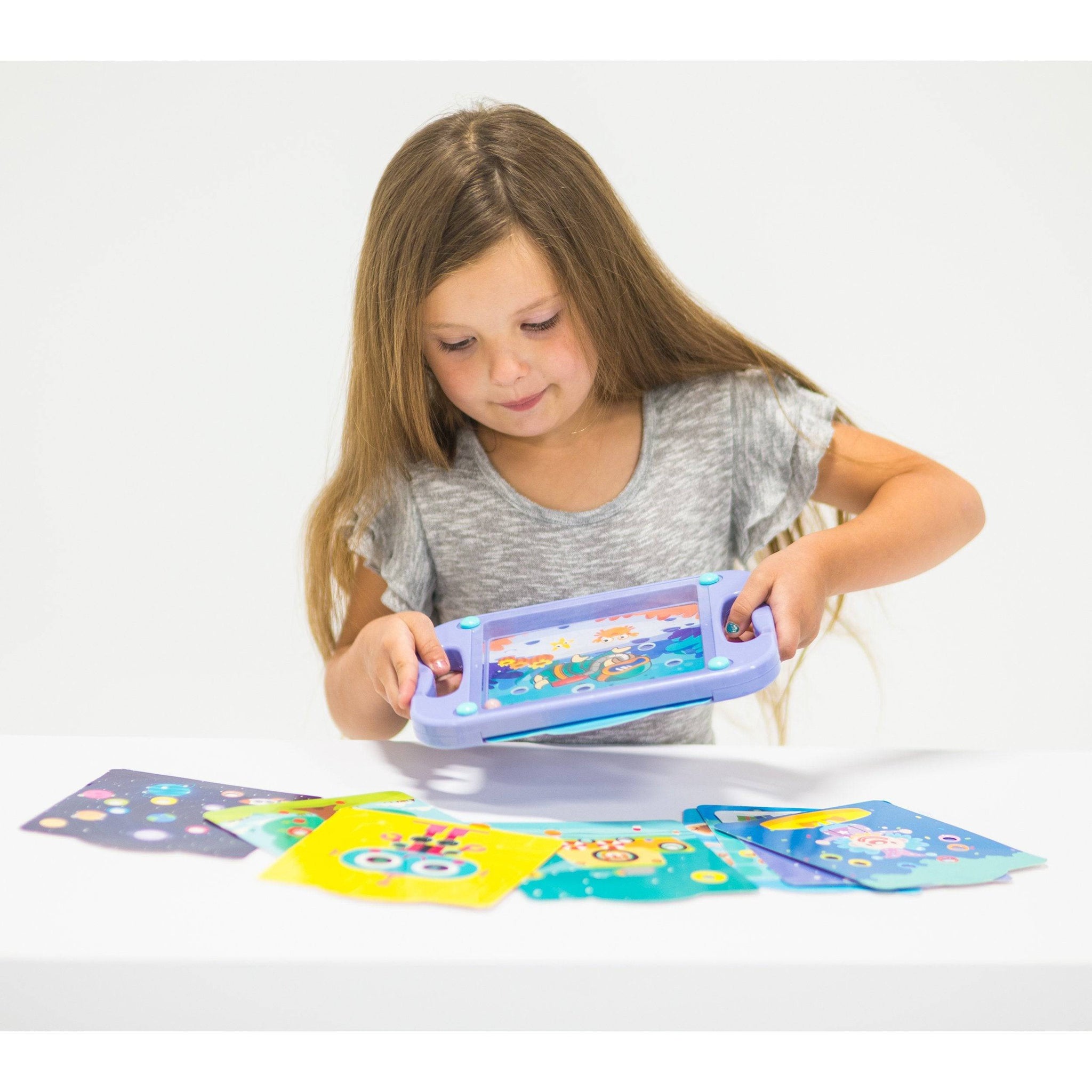 Sharpen your balancing skills, coordination and perseverance tilting the tray and trying to fill the open holes with the 6 colored balls. Swap out the fun illustrated cards. 10 different challenge cards included with varying levels of difficulty to keep it fun. Quite a bit more challenging than it seems. A great competitive challenge between children and adults. 9.4” x 6.8” x 0.8” / 23.8 x 17.2 x 2 cm.